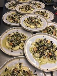 ° Carpaccio van kiwi en rivierkreeftjes, frisse salade en noten tapenade